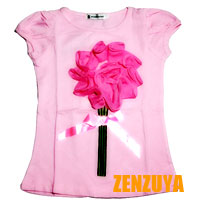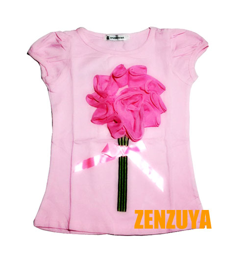 เสื้อเด็กผู้หญิง เป็นเสื้อยืดคอกลม พื้นสีชมพู แขนตุ๊กตา ประดับด้วยผ้าม้วนจัดกลีบเป็นดอกไม้ช่อใหญ่ น่ารักมากค่ะ