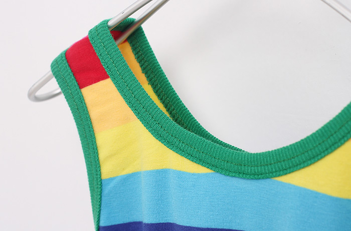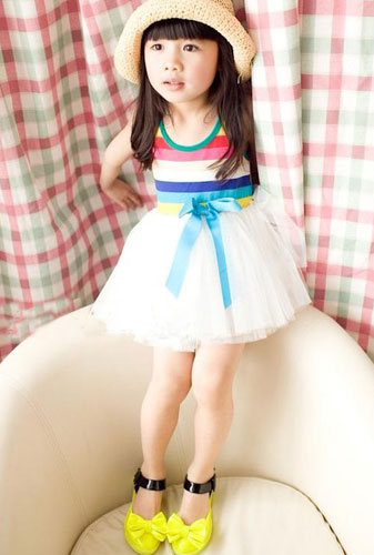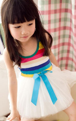 เดรสเด็กผู้หญิง ตัวเสื้อแขนกุดลายขวางหลากหลายสี กระโปรงบานฟูสีขาว มีโบว์สีฟ้าที่เอว
