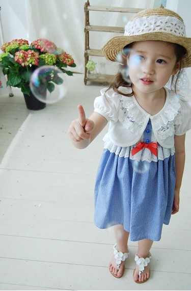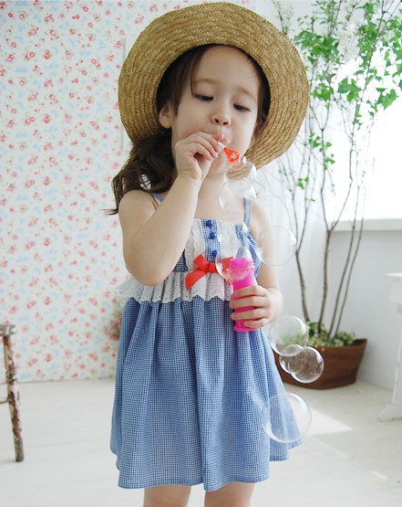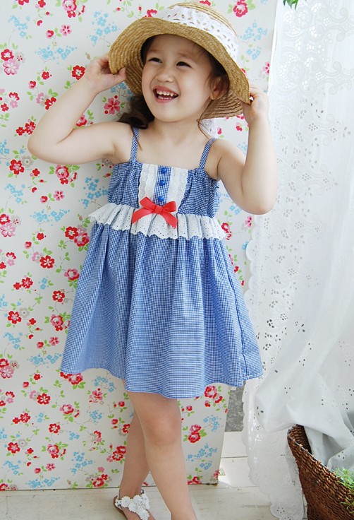 ชุดเดรสเด็กผู้หญิง สายเดี่ยว สีฟ้า รอบอกยางยืด มีลูกไม้ระบายที่เอว พร้อมโบว์สีแดง ดูสดใสน่ารัก