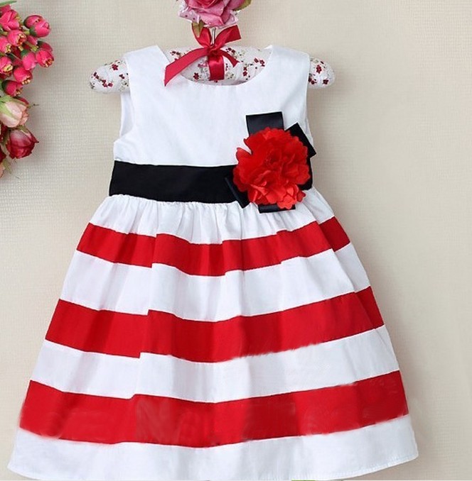 ชุดเดรสเด็กผู้หญิง สีขาว กระโปรงลายขวางสีแดงสลับสีขาว มีดอกไม้สีแดงที่เอว ดูสดใสมากค่ะ