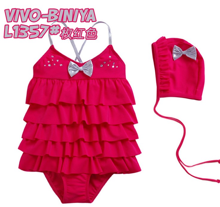ชุดว่ายน้ำเด็ก VIVO BINIYA สีชมพูเข้มระบายชั้นๆ มีโบว์สีเงินที่อก พร้อมหมวกเข้าชุด( หมดค่ะ)