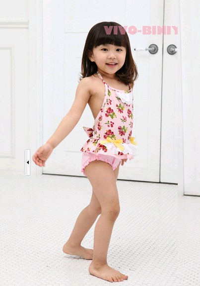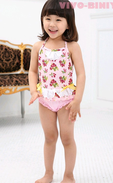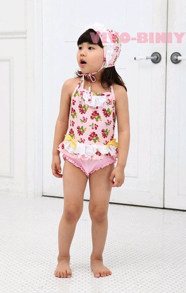 ชุดว่ายน้ำเด็ก VIVO BINIYA สีชมพู ลายดอกไม้ พร้อมหมวกเข้าชุด มีลูกไม้ระบายที่เอว และโบว์สีเหลืองเล็กๆประดับ ช่วยให้ชุดว่ายน้ำสาวน้อยน่ารักจริงๆค่ะ