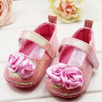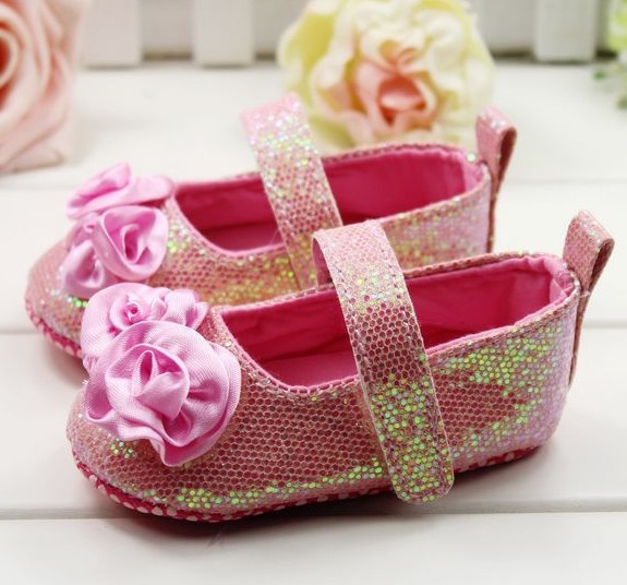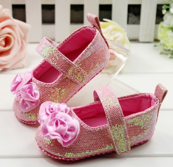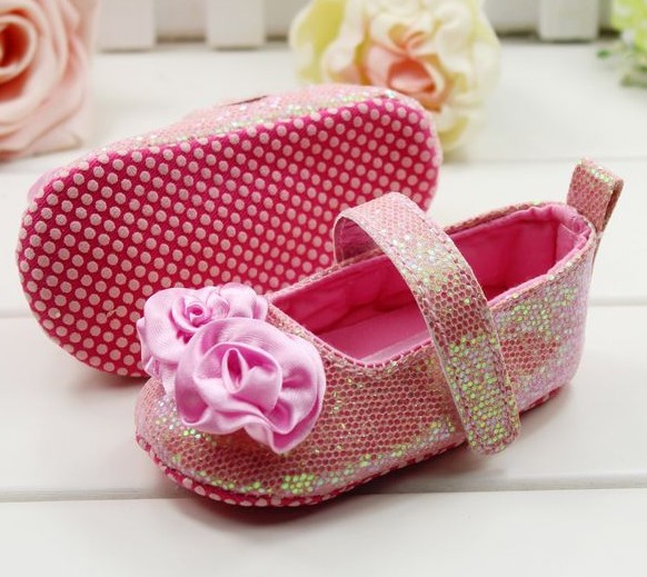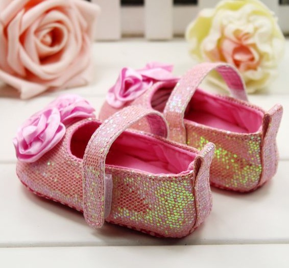 รองเท้าเด็กเล็ก สีชมพูวิบวับ ประดับดอกไม้สีชมพูเข้ากับรองเท้า น่ารักแบบหวานๆ