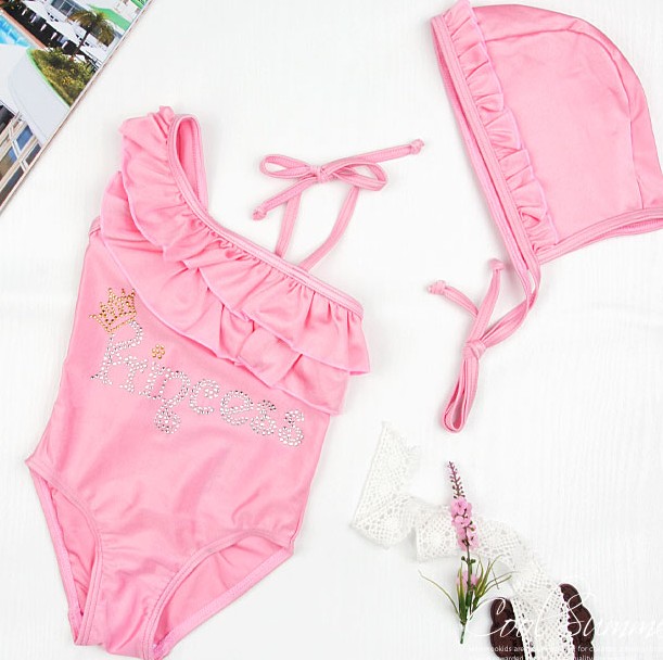 ชุดว่ายน้ำเด็ก VIVO BINIYA สีชมพู บ่าเฉียงเปิดไหล่ มีระบายที่อก สกรีนลาย Princess พร้อมหมวกเข้าชุด