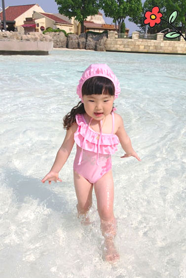 ชุดว่ายน้ำเด็ก VIVO BINIYA สีชมพู บ่าเฉียงเปิดไหล่ พร้อมหมวกเข้าชุด