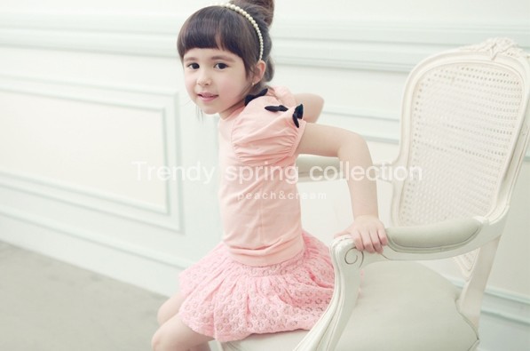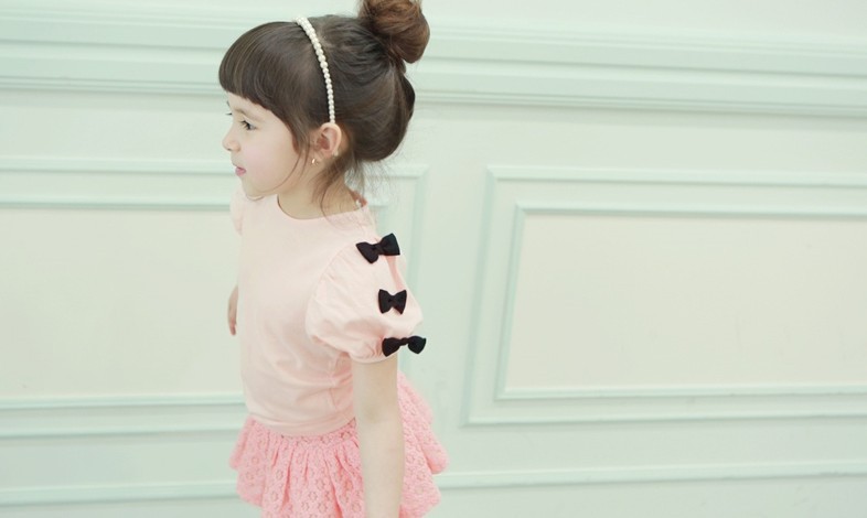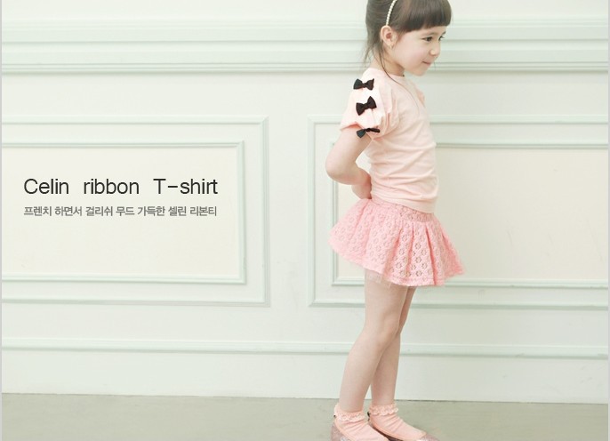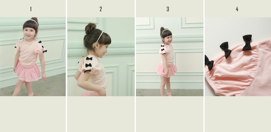 เสื้อผ้าเด็กผู้หญิง เสื้อสาวน้อย คอกลม สีชมพู แขนสั้นติดโบว์สีดำช่วยให้เสื้อดูหวาน มีให้เลือก 2 สี สีขาว และ สีชมพูค่ะ