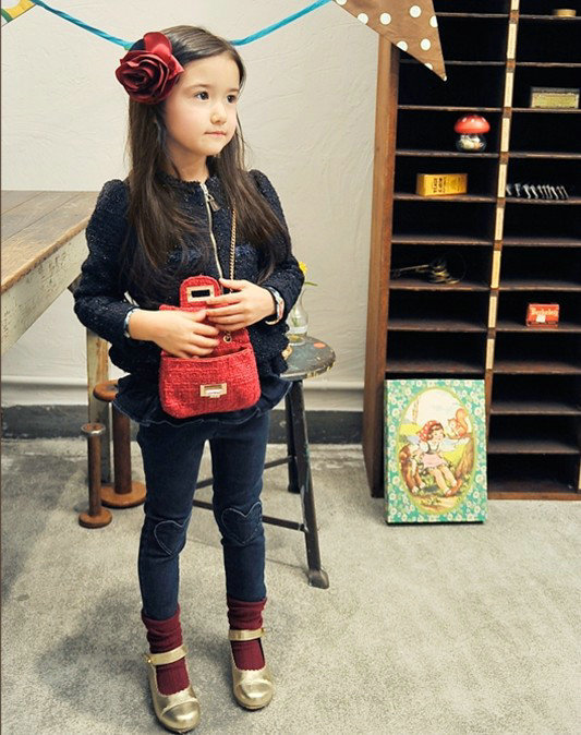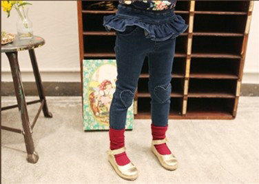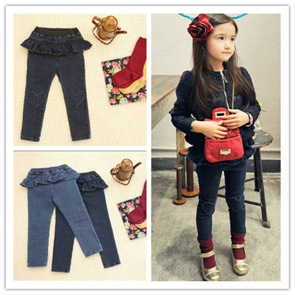 กางเกงยีนส์เด็กผู้หญิง ระบายรอบเอว มีหัวใจที่เข่ากิ๊บเก๋น่ารัก