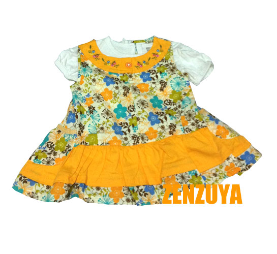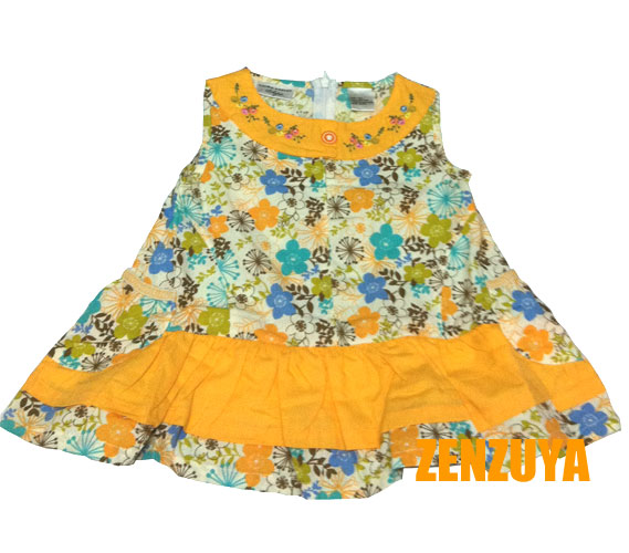 ชุดเดรสเด็กผู้หญิง สีส้ม ลายดอกไม้ แขนกุด มีซิปด้านหลัง ชายกระโปรงระบาย มีกระเป๋าเล็กๆน่ารักทั้งสองข้าง เส้นตัวในคอกลมสีขาว มีกระดุมด้านหลัง