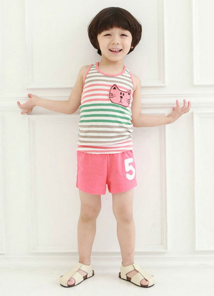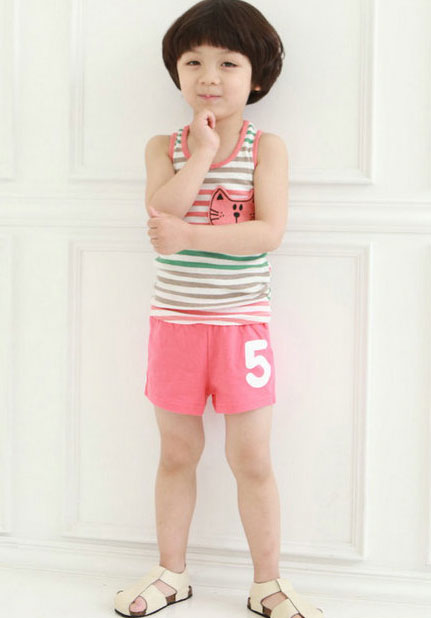 เสื้อยืดเด็กผู้ชาย แขนกุด ลายขวางสีชมพูสลับขาว มีแมวแปะที่อกเสื้อด้านซ้าย