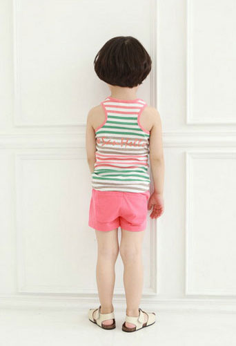เสื้อยืดเด็กผู้ชาย แขนกุด ลายขวางสีชมพูสลับขาว