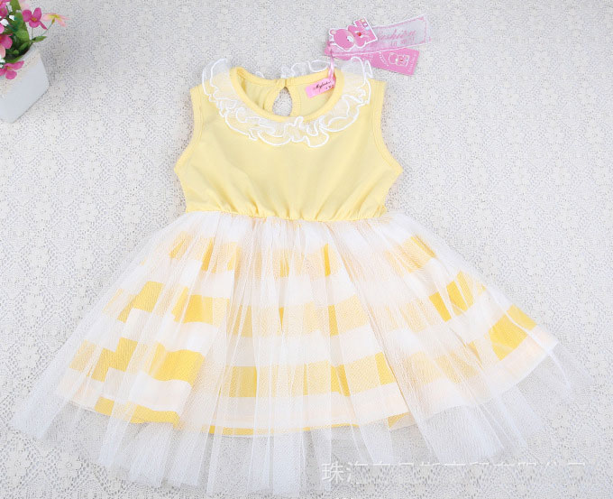 ชุดเดรสสาวน้อยแขนกุด สีเหลือง คอเสื้อมีลูกไม้ระบาย กระโปรงลายขวางสีเหลืองสลับขาว มีผ้าสีขาวบางคลุมอีกชั้นช่วยให้ชุดดูหวานสไตล์คุณหนู มีให้เลือก 2 สี สีเหลือง และ สีฟ้าค่ะ(หมดค่ะ)