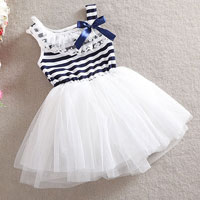 ชุดเดรสเด็กผู้หญิง แขนกุดลายขวางสีดำสลับขาว กระโปรงพองฟูสีขาว ติดผ้าลูกไม้หวานช่วงอกพร้อมติดโบว์สีน้ำเงินที่อกด้านซ้าย