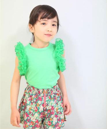 เสื้อเด็กผู้หญิง คอกลม สีเขียว มีระบายที่แขน