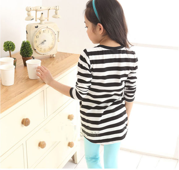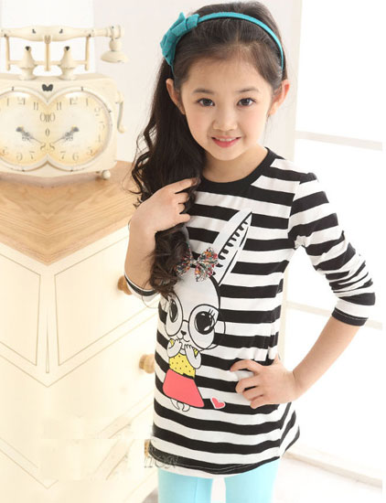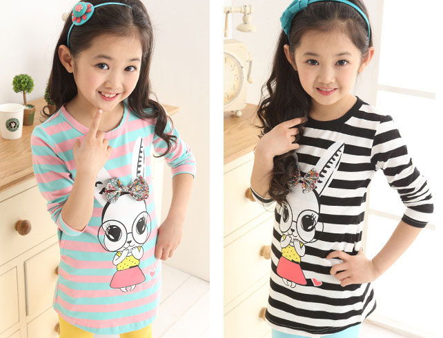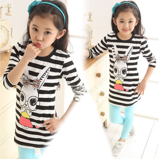 เสื้อเด็กผู้หญิง ลายขวางสีขาวสลับดำ แขนยาว กลางเสื้อมีรูปกระต่ายน่ารัก สำหรับเด็กโต สูง 120-160 ซม. มี 2 สี สีชมพูสลับฟ้า และ สีดำสลับขาวค่ะ