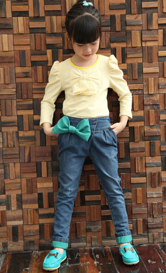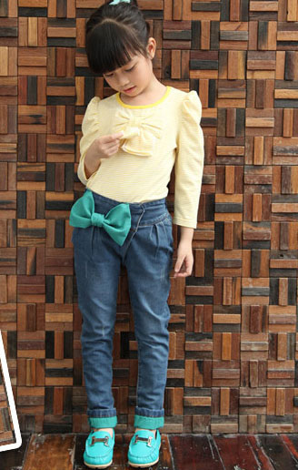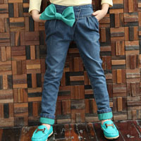 กางเกงยีนส์เด็กผู้หญิง ติดโบว์สีเขียวที่เอวด้านข้าง เอวยางยืดสวมใส่ง่าย ปลายขาพับขี้นโชว์ผ้าด้านในสีเขียวเก๋มากๆค่ะ สำหรับเด็กโตสูง 120-160 ซม.