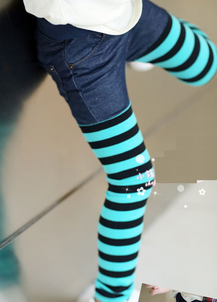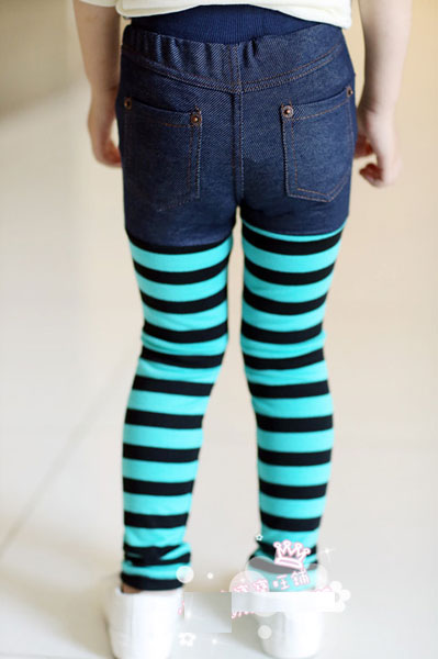 กางเกงยีนส์เด็ก ขายาว เอวยางยืดสวมใส่ง่าย ช่วงขาเป็นลายขวางสีฟ้าสลับดำ