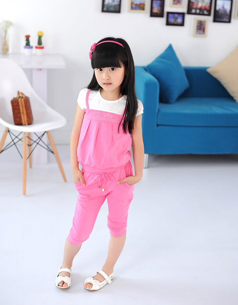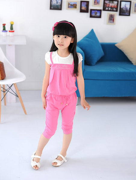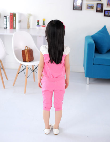 เสื้อผ้าเด็กผู้หญิง เสื้อคอกลม แขนสั้น สีชมพู พร้อมกางเกงสามส่วนเข้าชุด มี size ตั้งแต่เด็กเล็กถึงเด็กโต สูง 100-160 ซม.