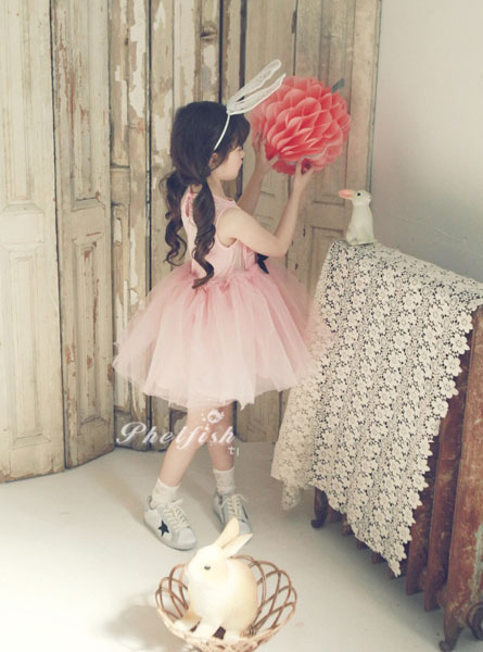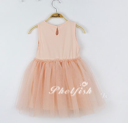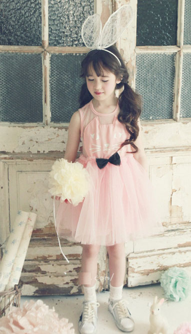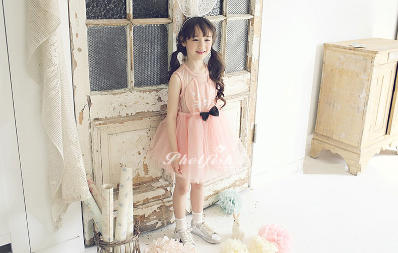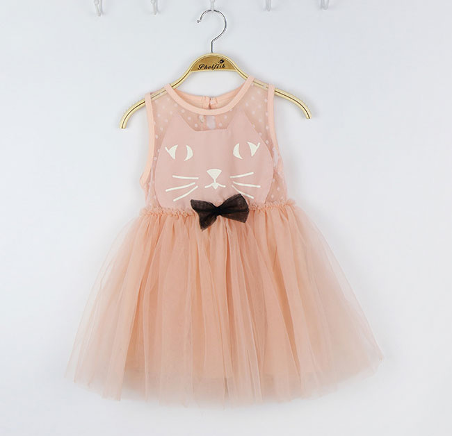 ชุดเดรสเด็กผู้หญิง สีชมพู ตัวเสื้อลายแมว ซีทรูช่วงไหล่ ลายจุด กระโปรงพองฟูน่ารักมากค่ะ ติดโบว์สีดำที่เอว แบรนด์ Phelfish สินค้าคุณภาพดี