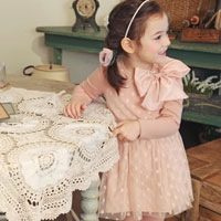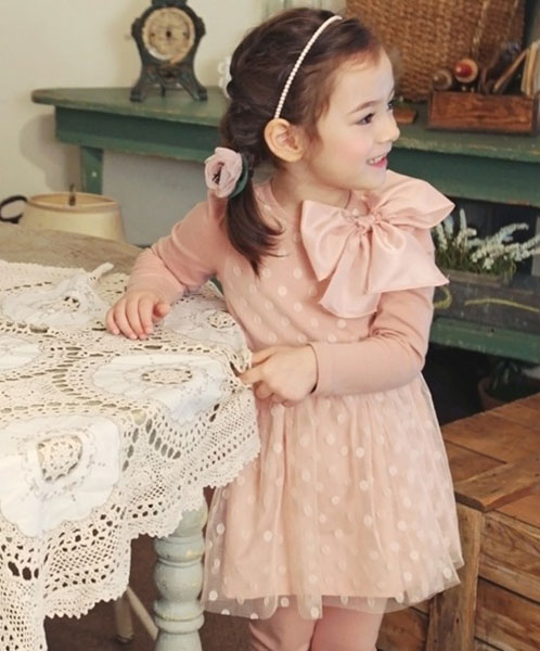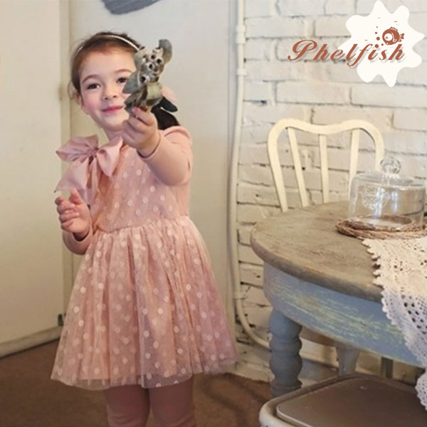 ชุดเดรสเด็กผู้หญิง สีชมพู แขนยาว ลายจุดขาวทั่วตัว กระโปรงพองฟู ติดโบว์ใหญ่ที่อกดูหรูหราใส่ออกงานได้ค่ะ แบรนด์ Phelfish สินค้าคุณภาพดีค่ะ