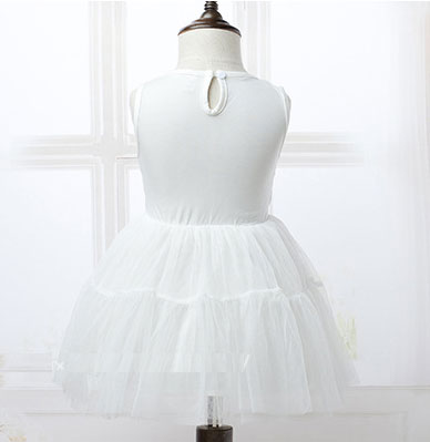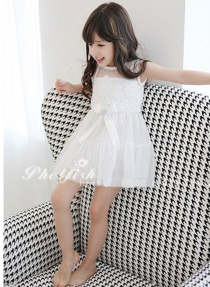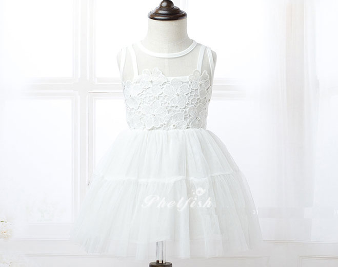 ชุด เดรสเด็กผู้หญิง สีขาว แขนกุด ซีทรูช่วงเหนืออก ช่วงตัวประดับดอกไม้สีขาว กระโปรงพองฟู ติดโบว์ที่เอว แบรนด์ Phelfish สินค้าคุณภาพดี