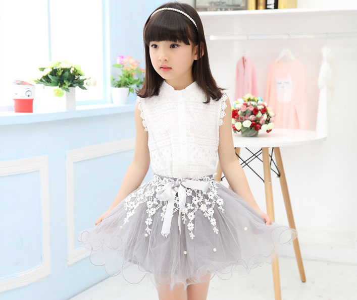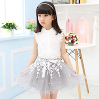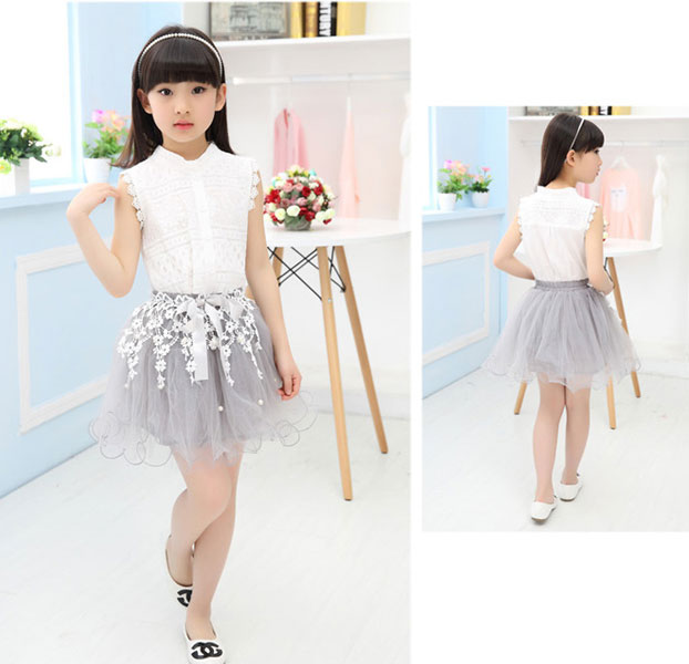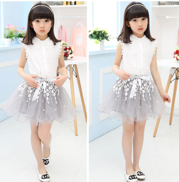 ชุดเซ็ตเด็กผู้หญิง เสื้อสีขาวแขนกุด กระโปรงพองฟูสีเทาอ่อน ประดับลูกไม้ ติดโบว์ที่เอว