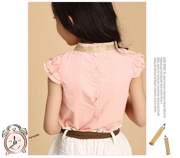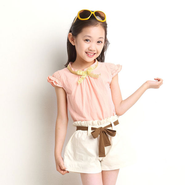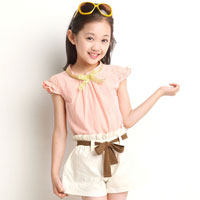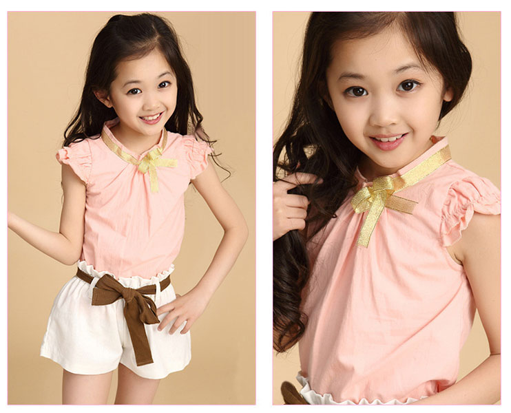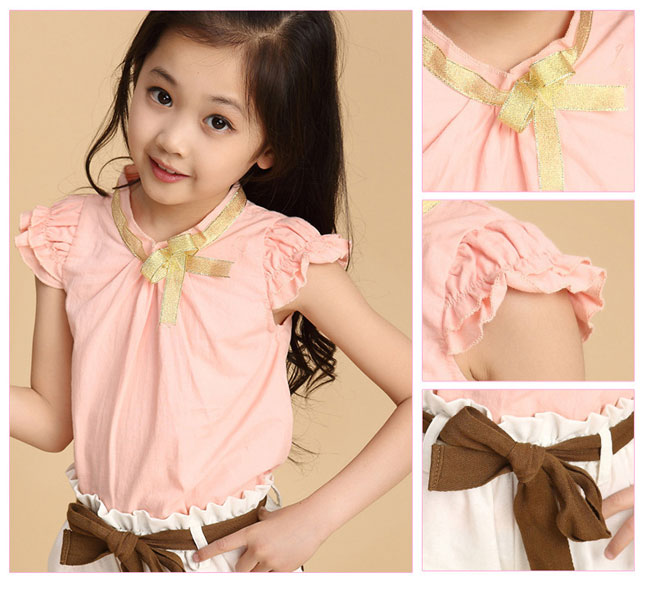 ชุดเซ็ตเด็กผู้หญิง เสื้อ พร้อมกางเกงขาสั้น เสื้อสีชมพู แขนระบาย กระดุมหลัง ติดโบว์สีทองที่คอ กางเกงขาสั้นสีขาว พร้อมผ้าคาดเอวสีน้ำตาลเข้าชุด