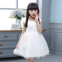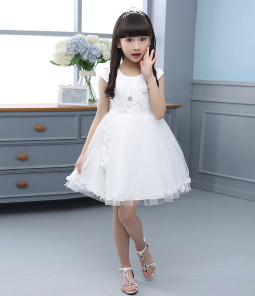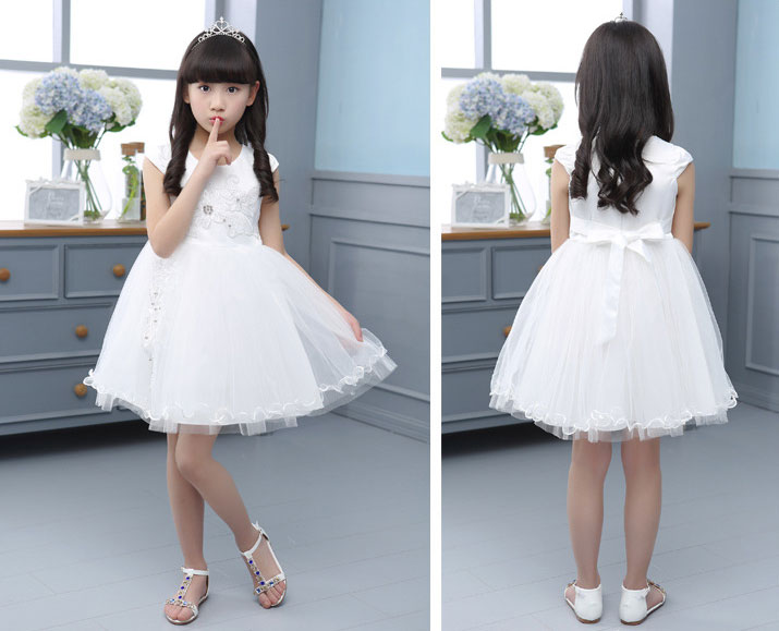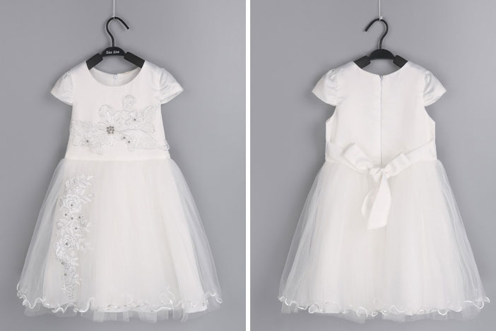 ชุดเดรสสีขาวล้วน ประดับดอกไม้ที่เสื้อ และกระโปรง ผูกโบว์ด้านหลัง กระโปรงพองฟู ดูหรูหราใส่ออกงานได้ค่ะ