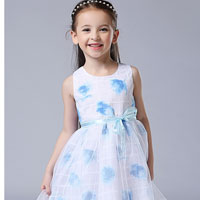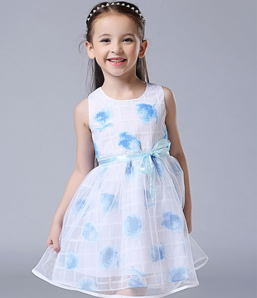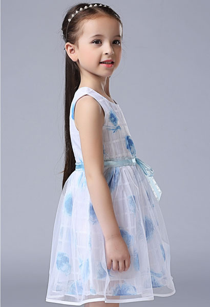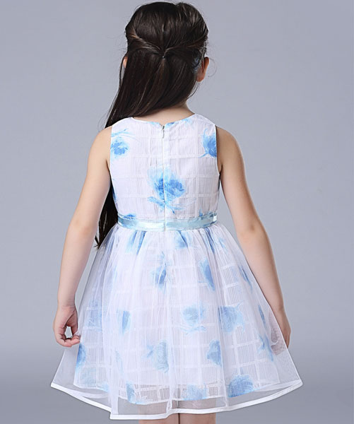 ชุดเดรสเด็กผู้หญิง แขนกุดสีขาว ลายดอกไม้สีฟ้า