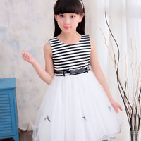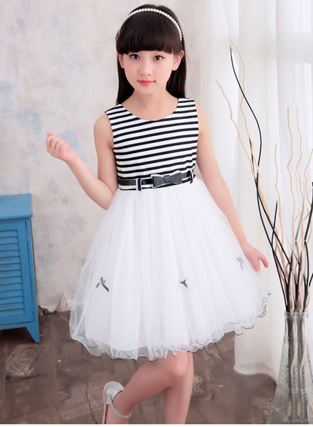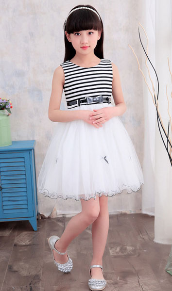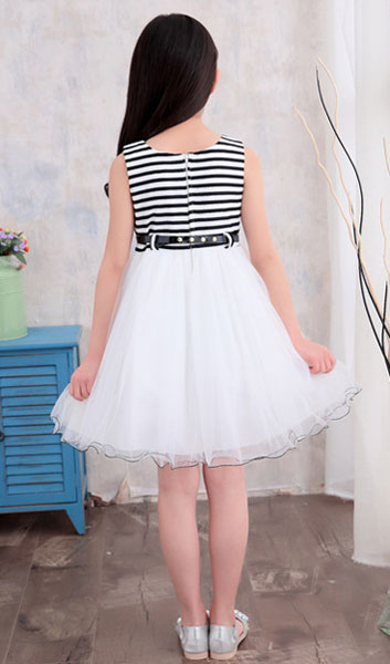 ชุดเดรสแขนกุด ตัวเสื้อลายขวางสีขาวสลับดำ ซิบหลัง กระโปรงพองฟูสีขาว ประดับโบว์เล็กๆสีดำ มาพร้อมเข็มขัดเข้าชุด
