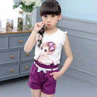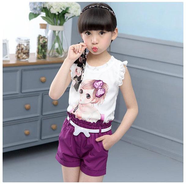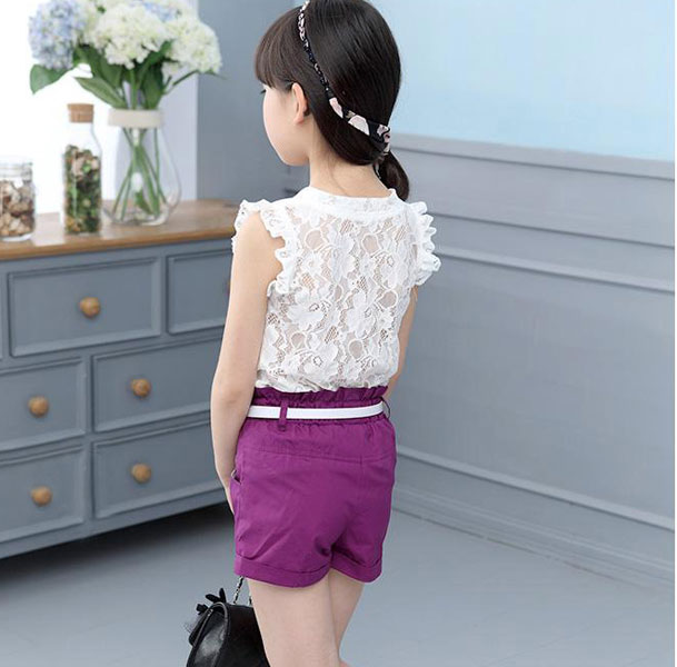 ชุดเซ็ตเด็กผู้หญิง เสื้อขาวลายการ์ตูนด้านหลังเป็นลูกไม้ พร้อมกางเกงขาสั้นสีม่วงเข้าชุด มีเข็มขัดให้ด้วยค่ะ