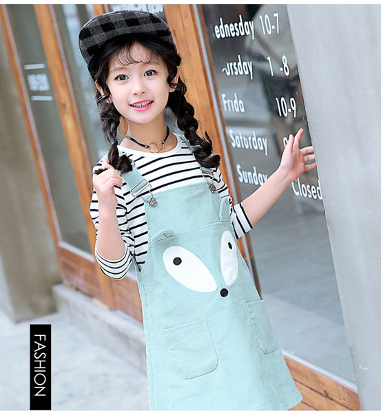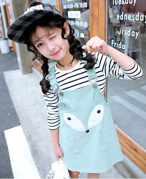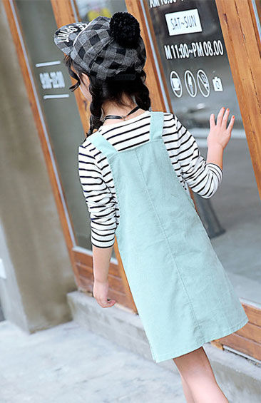 ชุดเอี๊ยมกระโปรงสีเขียว พร้อมเสื้อตัวในลายขวางสีดำสลับขาว แขนยาว