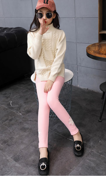 เลกกิ้งเด็กผู้หญิง สีชมพู ติดดอกไม้ปลายขา