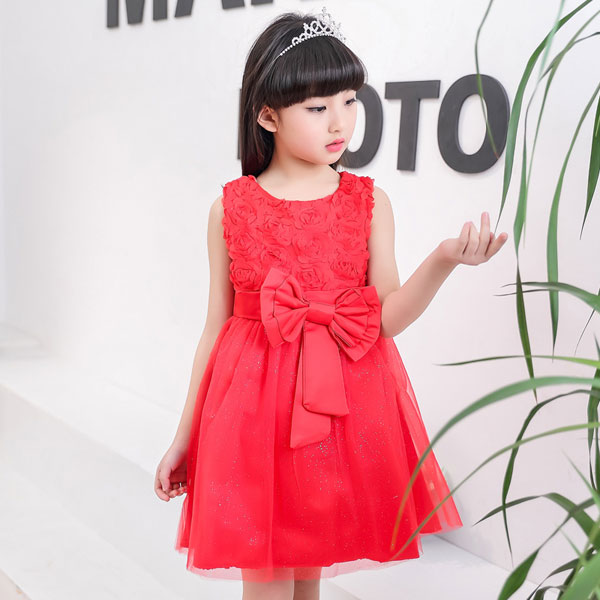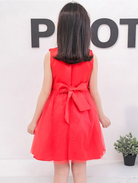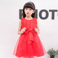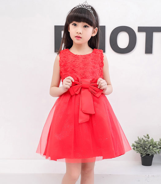 ชุดเดรสสีแดง แขนกุด ช่วงบนลายดอกไม้ ผูกโบว์ที่เอว กระโปรงพองฟู ใส่ออกงานได้ค่ะ