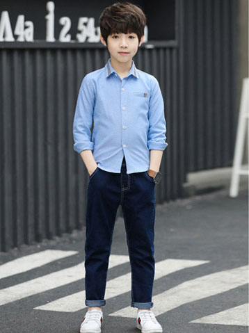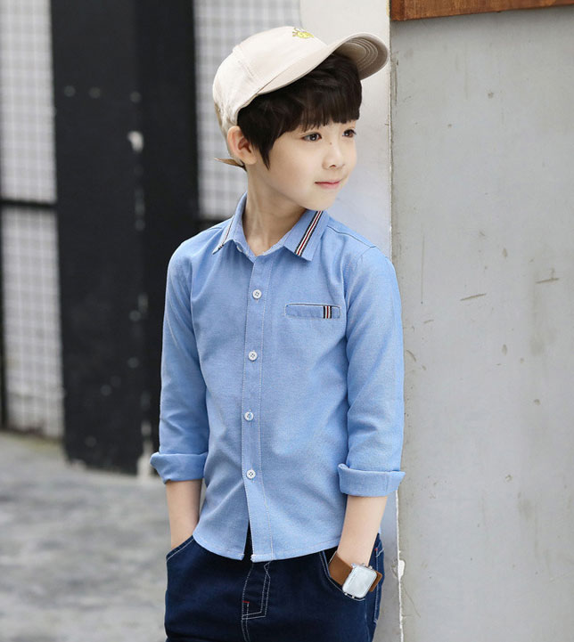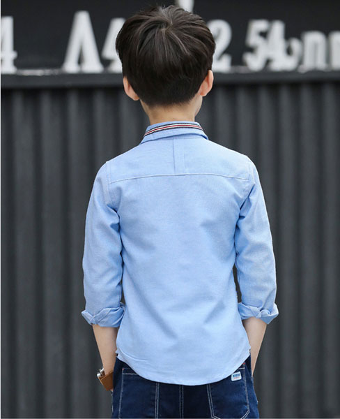 เสื้อเชิ้ตเด็กผู้ชาย สีฟ้าแขนยาว คอปกและกระเป๋าเสื้อตกแต่งลวดลาย
