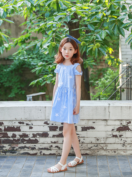 ชุดเดรสเด็กผู้หญิง เปิดไหล่สีฟ้า