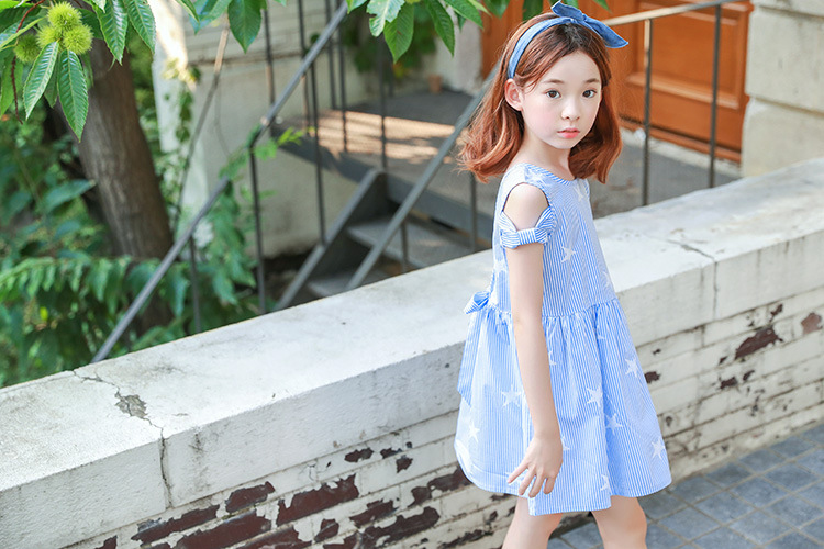 ชุดเดรสเด็กผู้หญิง เปิดไหล่สีฟ้า ลายดาวน่ารักๆ เอวด้านหลังติดโบว์