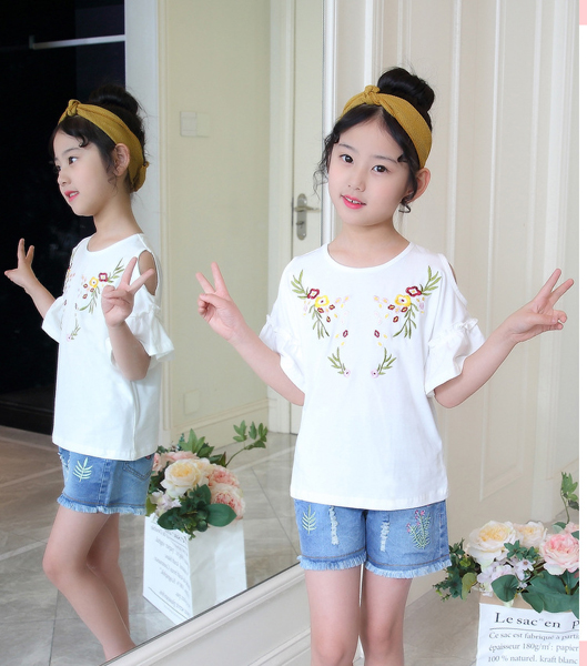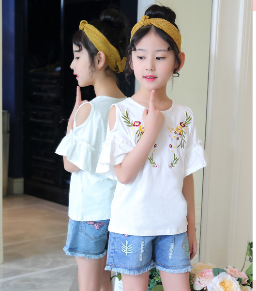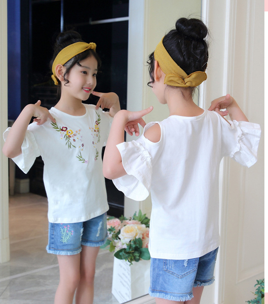 เสื้อเด็กผู้หญิง สีขาว เปิดไหล่ แขนระบาย ตกแต่งลายดอกไม้