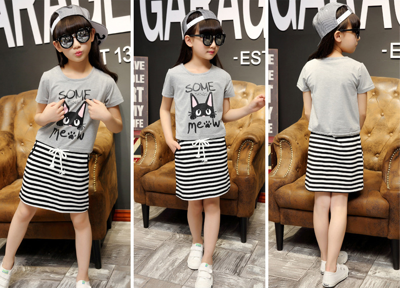 ชุดเซ็ตเด็กผู้หญิง ชุดเดรสสีขาวสลับดำ พร้อมเสื้อคลุมสีเทาแขนสั้นลายแมวกิ๊บเก๋