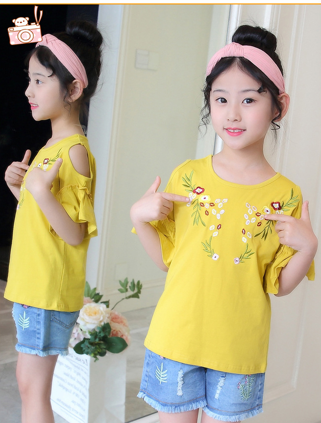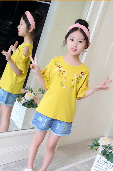 เสื้อเด็กผู้หญิง สีเหลือง เปิดไหล่ แขนระบาย ตกแต่งลายดอกไม้