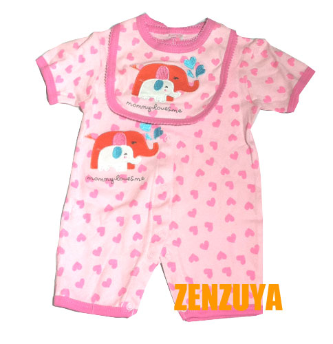 บอดี้สูทเด็กแขนสั้นสีชมพู สกรีนลายหัวใจทั่วทั้งตัว ปักช้างน้อยและเพื่อนน่ารักๆ มาพร้อมผ้ากันเปื้อนเด็กเข้าชุด